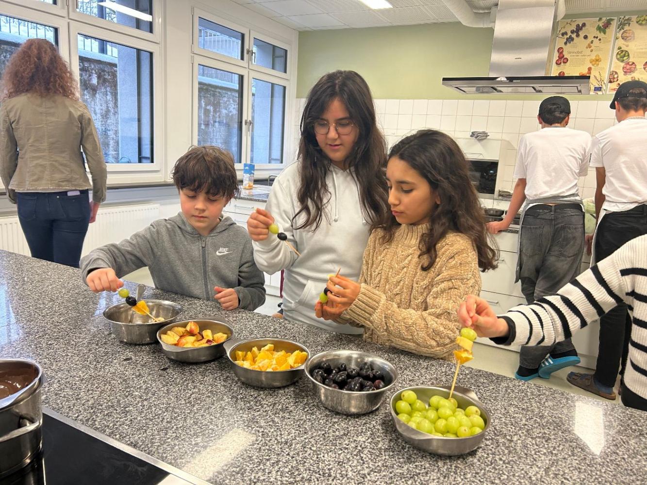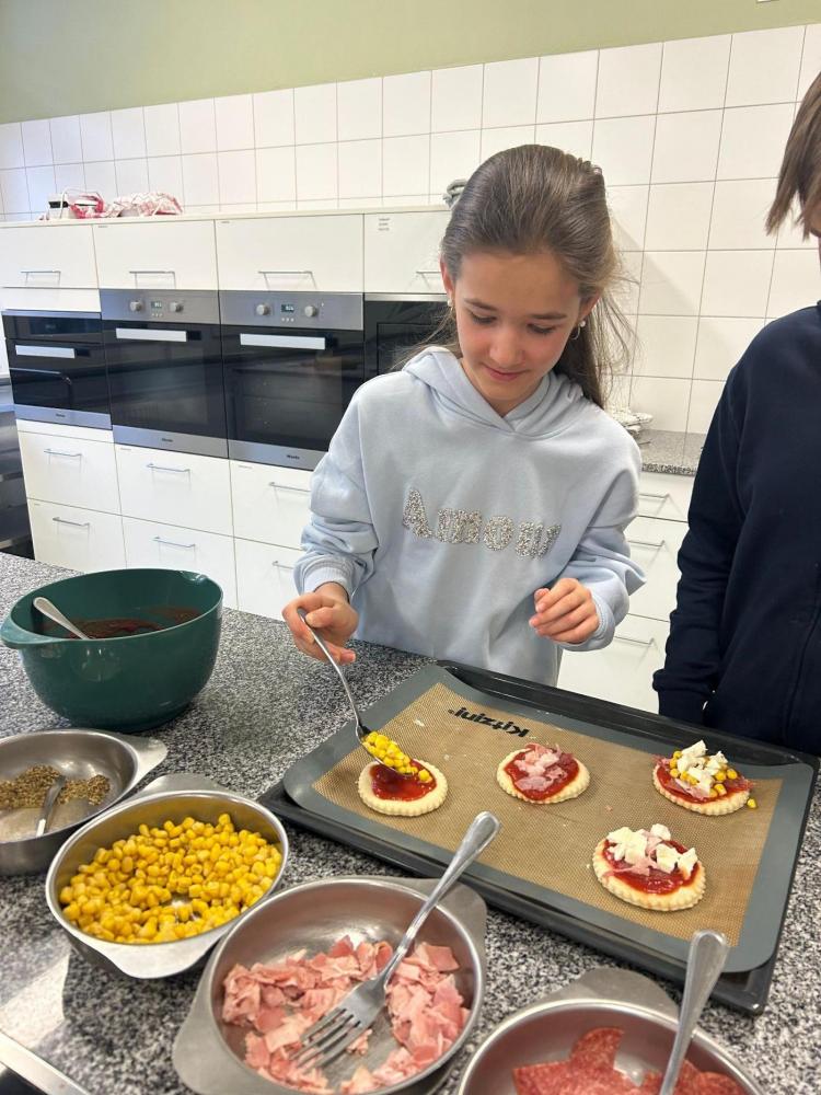 * Kochen: Pizza und Obstspieße zubereiten, Geruchs- und Geschmacksspiele, Küchengeräte benennen